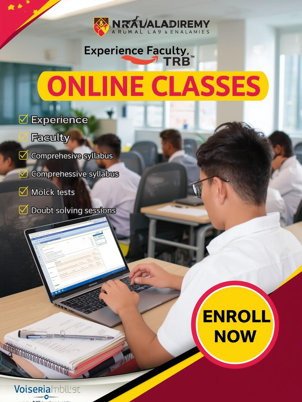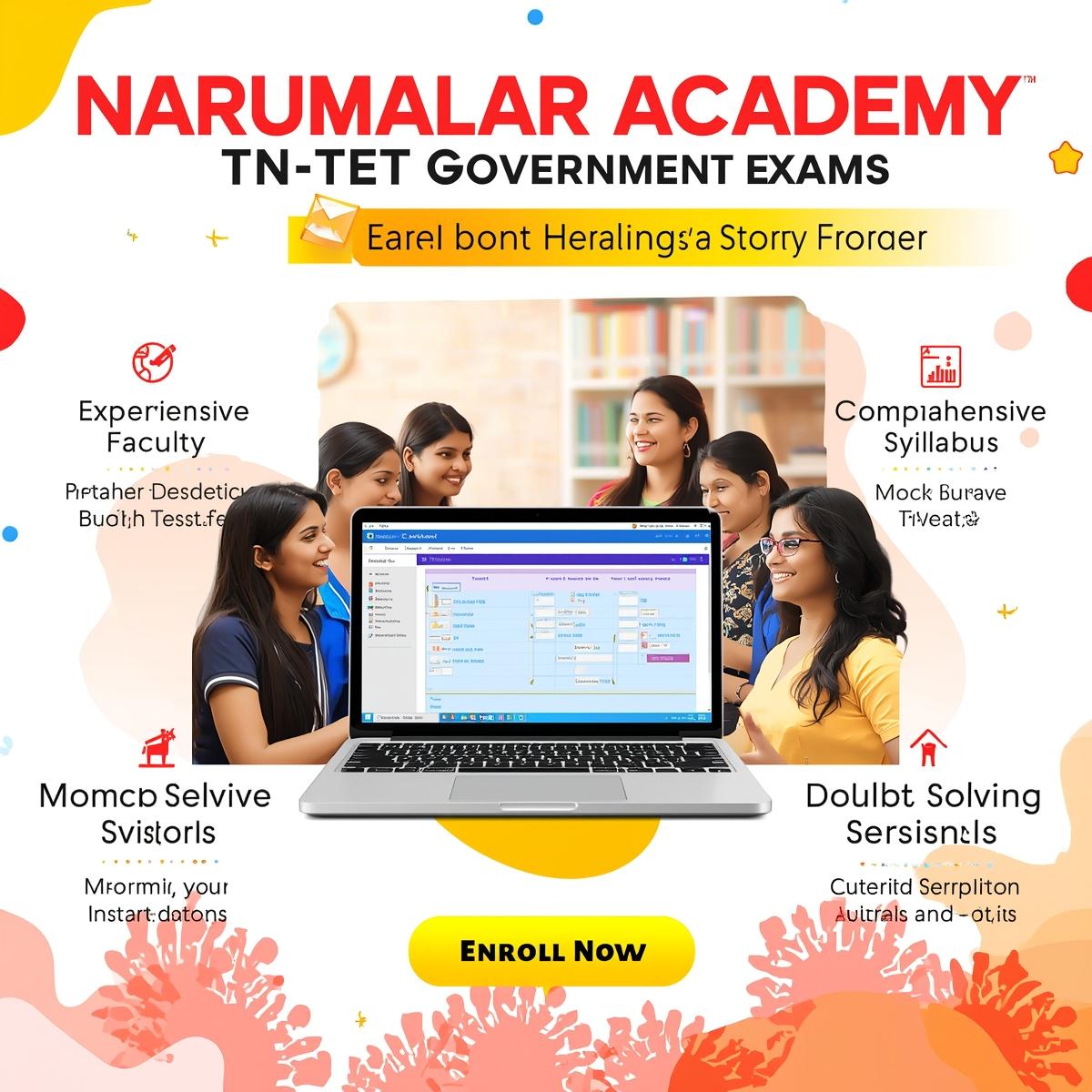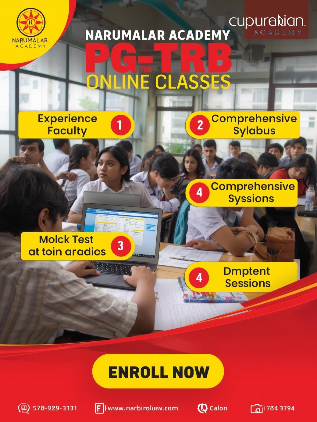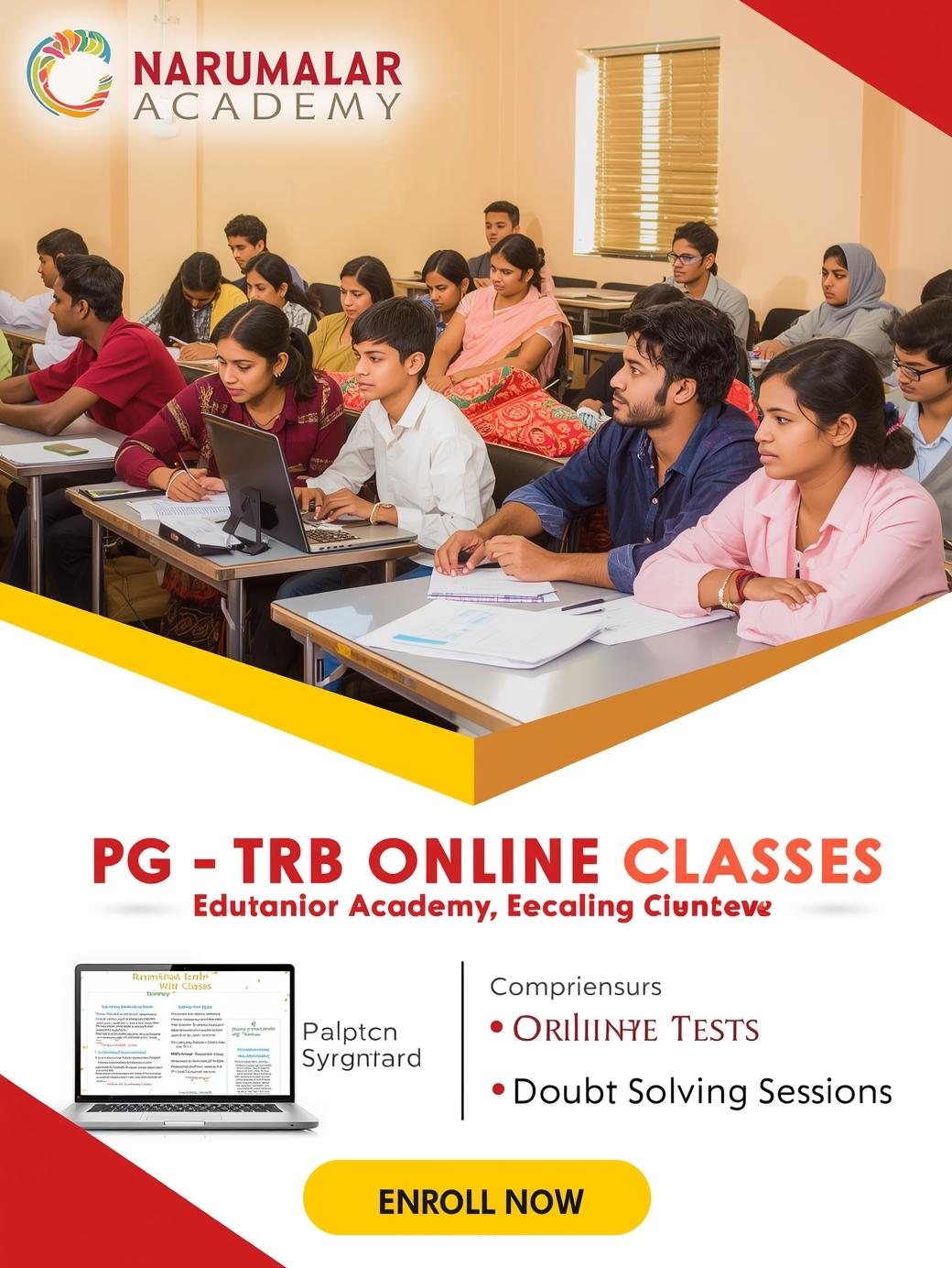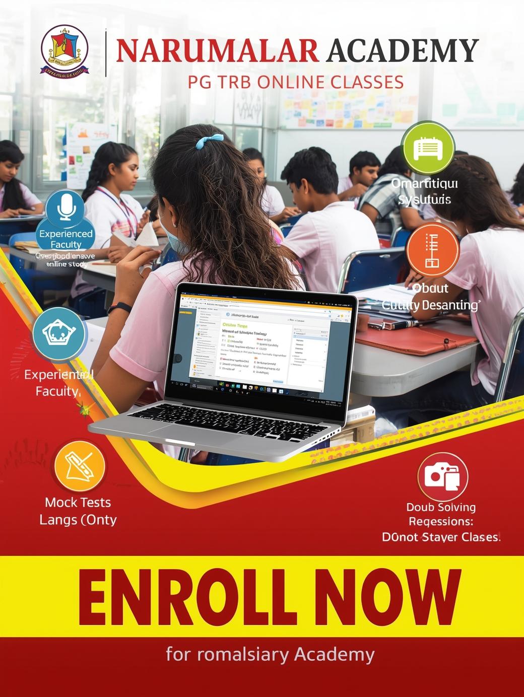 நறுமலர் அகாடமி, தேர்வுக்கு முன் நேரடி வகுப்புகளை (ONLINE CLASSES) பங்கேற்பதற்காக சிறந்த பயிற்சிகளை வழங்கி வருகிறது. இது ஆசிரியர்களை நேரடியாக மாறுபட்ட தேர்வு வழிமுறைகள் மற்றும் கல்வி உத்திகள் மூலம் முறையாக தேர்வு செய்ய உதவுகிறது.நறுமலர் அகாடமி தங்களது தேர்வுக்கான பயிற்சி வகுப்புகளை முழுமையாக மாற்றுவதுடன், அனைத்து மாணவர்களுக்கு திறமையான பயிற்சியை வழங்கி, அவர்களின் கல்வி வாழ்க்கையில் வெற்றியை அடைய உதவி செய்கின்றது.